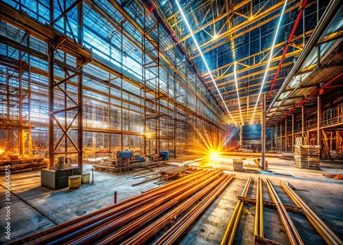 Captivating Long Exposure of a Construction Site Interior Under Construction, Showcasing Dynamic Lighting and Active Machinery in a Modern Building Development