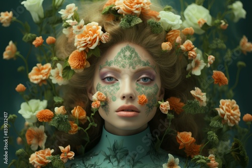 Captivating portrait of an enchanting forest queen adorned with floral crown in a mystical and ethereal setting, inspired by nature and fantasy