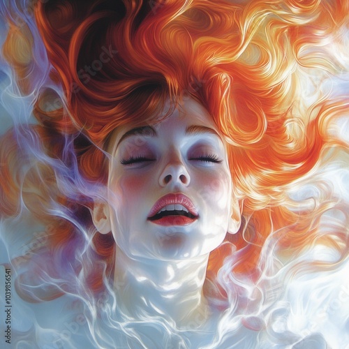 Captivating red-haired woman floating in ethereal water with wisps of mist at dawn