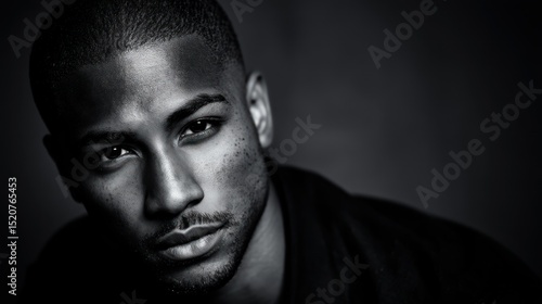 Capture a confident portrait featuring a steady gaze and a firm expression that conveys quiet determination. Use high-contrast lighting to emphasize defined facial contours against a simple backdrop