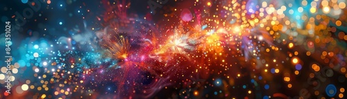 Capture a vibrant side view of fireworks illuminating the night sky, showcasing a colorful burst with intricate details in digital art