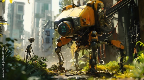Capture the dynamic Robotics advancements in a wide-angle view, blending the mechanical precision with a touch of romantic storytelling Emphasize unexpected camera angles to instill intrigue and charm