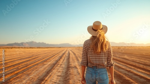 Captured in golden fields, a woman in a straw hat walks along furrows, symbolizing connection to nature and the essence of farm life, evoking feelings of nostalgia and simplicity.