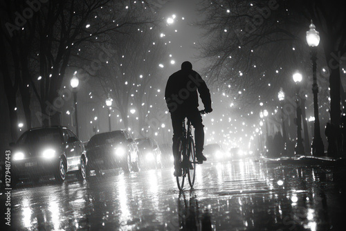 captures the silhouette of a man riding a bicycle on a wet street at night.
