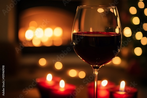 Capturing cozy warmth, a red wine glass stands before a candlelit backdrop, surrounded by warmth and creating an intimate ambiance ideal for elegant soirées.