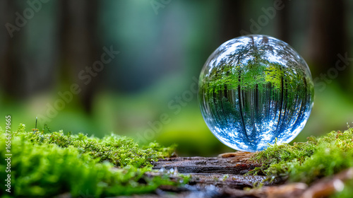 Capturing reflections in nature's sphere. A glass sphere reflects lush greenery and tall trees in a serene forest setting, emphasizing nature's beauty.