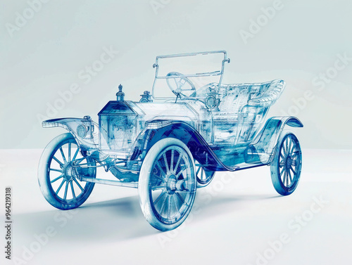 Car 1890s visualization with augmented reality Transparent car in studio drawing in blue colors blueprint glowing neon hologram futuristic show technology security for premium product business finance