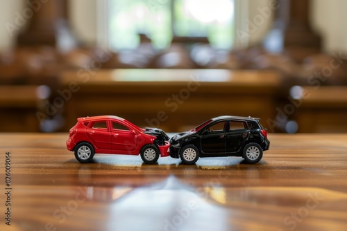 Car accident litigation concept with two crashed toy cars and gavel in court