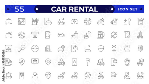 Car and rent simple minimal thin line icons. Related car rent, repair, transport, travel. Car dealer, vehicle and automobile industry related outline icons set.