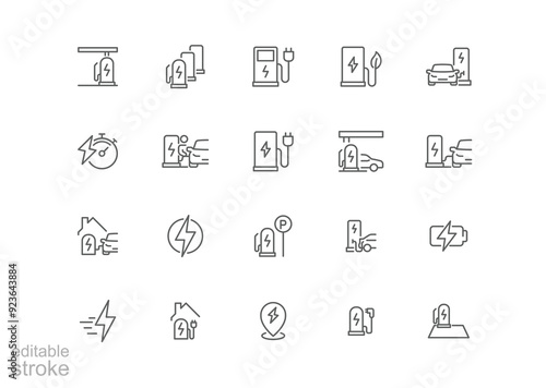 Car charging station icon set. Simple outline style. EV, electric socket station, car plugged to charge, battery, technology concept. Thin line symbol. Vector illustration isolated. Editable stroke.