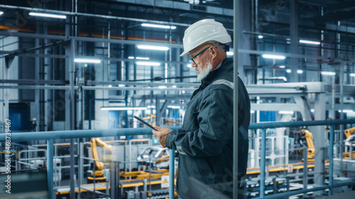 Car Factory: Male Automotive Engineer Wearing Hard Hat, Standing Using Tablet Computer. Monitoring, Control, Equipment Production. Automated Robot Arm Assembly Line Manufacturing Electric Vehicles