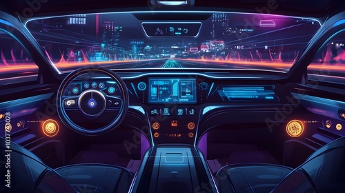 Car interior with Self driving , Auto pilot and internet of thin futuristic . icon illustration . Autonomous car system technology concept .