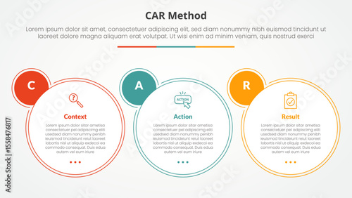 CAR interview model infographic concept for slide presentation with big circle outline and badge on right with 3 point list with flat style