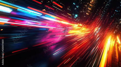 Car light trails in the city at night, captured as streaks of colorful light against the dark urban background, showcasing the speed, movement, and dynamic energy of modern transportation.