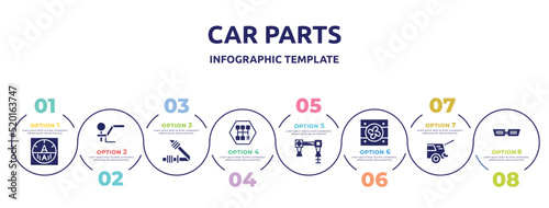 car parts concept infographic design template. included car ammeter, car towbar, seat belt or safety belt, gearbox, torsion bar, fan, taiate, grille or radiator grille icons and 8 option or steps.