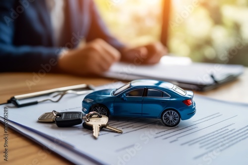 Car purchase or lease paperwork with keys and a toy car symbolizing a new deal.