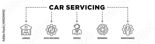 Car servicing web banner icon set vector illustration concept, infographic icon flow process which consists of repairing, maintenance, service, auto mechanic, garage icon live stroke and easy to edit