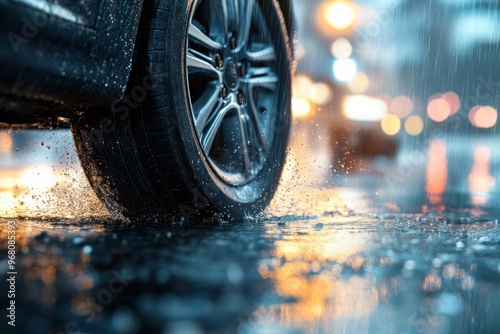 Car Tire Splashing Water on Wet Pavement in Rain
