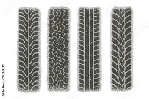 Car tire tracks various patterns on fresh snow showing winter road vehicles driving conditions