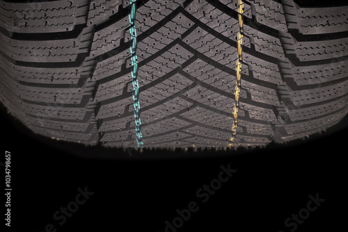 Car tire tread showcasing intricate pattern and colorful markings for enhanced grip and safety
