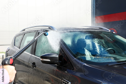 Car washed with a high-pressure jet under bright sunlight, emphasizing sparkling cleanliness, professional maintenance, and contemporary vehicle care (part of the “at the car wash” series).