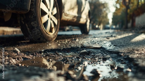 car wheels running and closed up Very bad quality street with potholes. have tree. Damaged asphalt pavement road with potholes in city, dangerous, broken, garage
