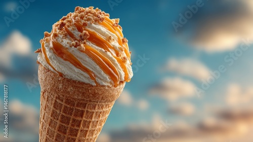 Caramel ice cream cone with crunchy topping held against a dreamy sky background.