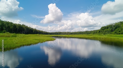 Carbon Reforestation Projects Concept, Scenic Wetland Landscape with Lush Greenery and Reflections in Calm Waters under a Bright Blue Sky
