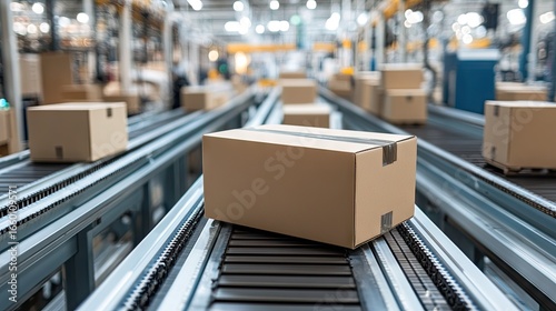Cardboard box in focus on automated assembly line, showcasing modern manufacturing, robotics, and streamlined logistics process