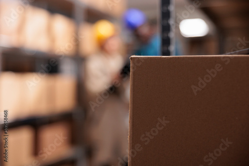 Cardboard box lying on logistics and distribution warehouse room shelf. Carton package on metal racks structure in factory industrial storehouse close up with blurred background