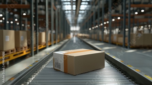 Cardboard boxes being transported on conveyor belt in automated warehouse fulfillment center