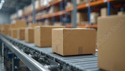 Cardboard boxes glide on conveyor belt modern warehouse. Automated system logistic for efficient delivery. E-commerce fulfillment center with product packages. Automation innovation for global supply