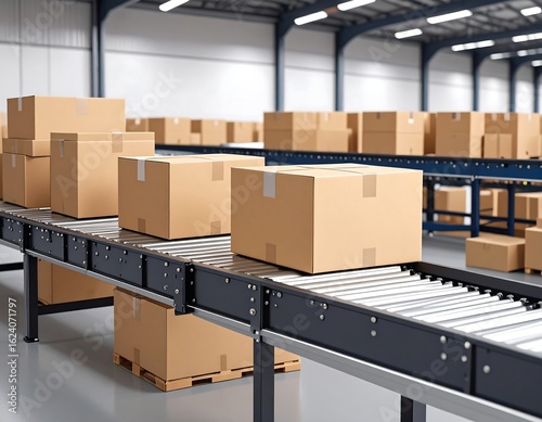 Cardboard boxes move along a conveyor belt in a large warehouse
