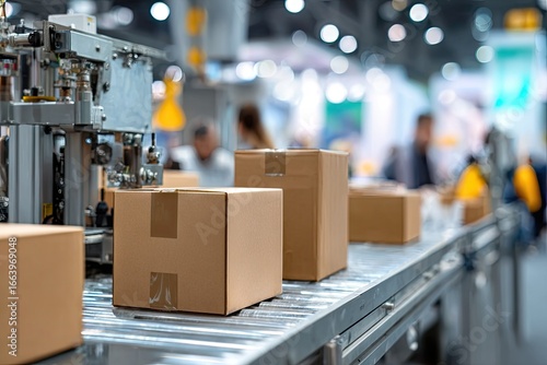 Cardboard boxes moving on an automated conveyor belt in a factory.