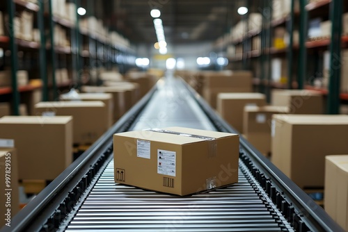 Cardboard boxes on conveyor belt in distribution warehouse