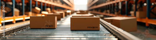 Cardboard boxes on conveyor rollers ready to be shipped by courier for distribution. AI generated