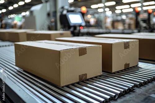 Cardboard boxes on factory conveyor belt with automated packaging system in background