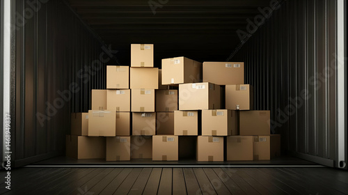 Cardboard Boxes Stacked Inside a Dark Shipping Container