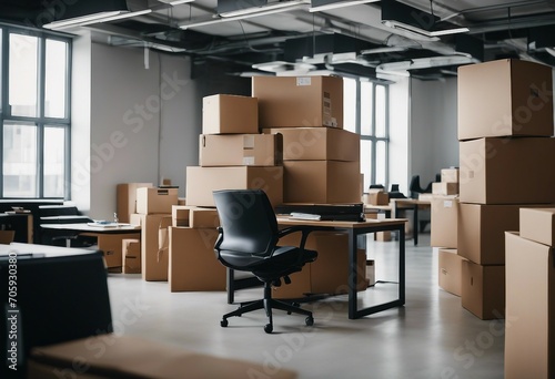 Cardboard boxes with moving stuff and office chair in an empty office room space