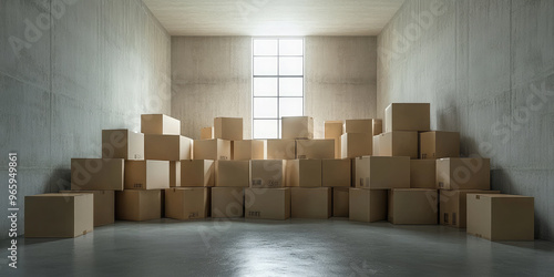 Cardboard moving boxes are stacked in an empty room. Sunlight is shining through the windows, creating a warm and inviting atmosphere