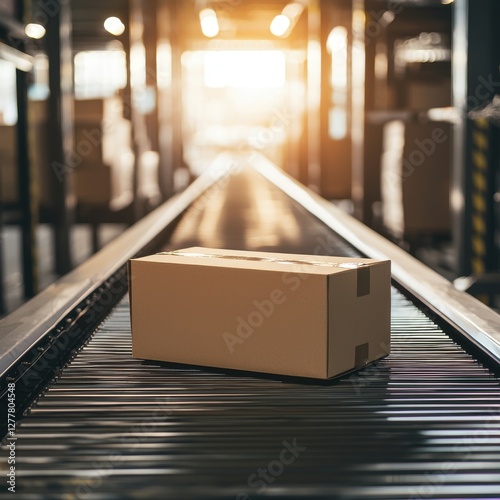 Cardboard Package on Conveyor Belt in Warehouse at Sunrise