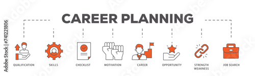 Career icons process flow web banner illustration of define goal, checklist, strengths weaknesses, motivation, qualification, support and success icon live stroke and easy to edit