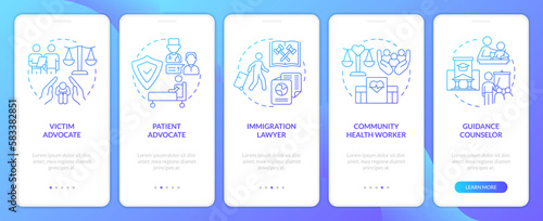 Careers in advocacy blue gradient onboarding mobile app screen. Lawyer jobs walkthrough 5 steps graphic instructions with linear concepts. UI, UX, GUI template. Myriad Pro-Bold, Regular fonts used