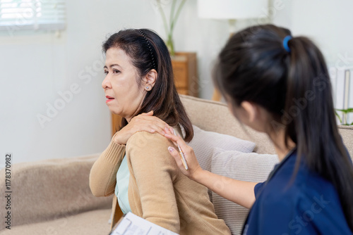 Caregiver checks symptoms of elderly patient with doctor in a cozy home environment