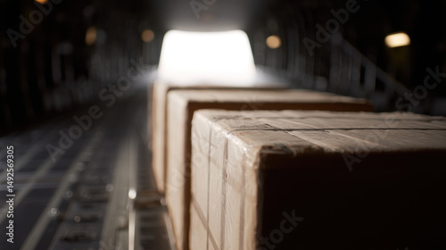 Cargo boxes on conveyor inside aircraft with bright light ahead