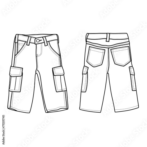 Cargo jeans shorts front and back view. Men's casual wear. Vector technical sketch.