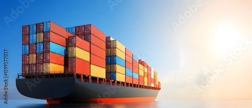 Cargo ship loaded with containers sailing on the ocean under a bright sky.
