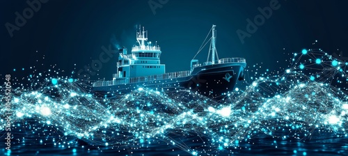 Cargo Ship Navigating Through Digital Network of Connected Dots and Lines on a Dark Blue Background.
