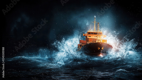cargo ship navigating through turbulent waters, illuminated by dramatic lighting, creates powerful and adventurous scene