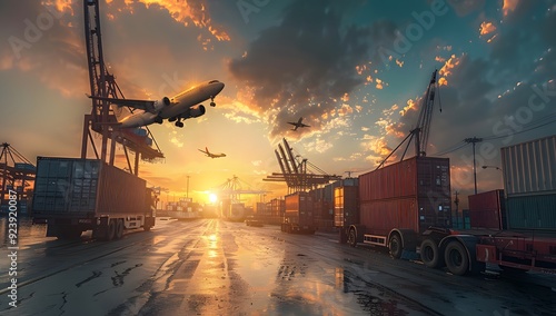 Cargo truck and an airplane flying over the shipyard with containers, at sunset, with large cranes in the background.